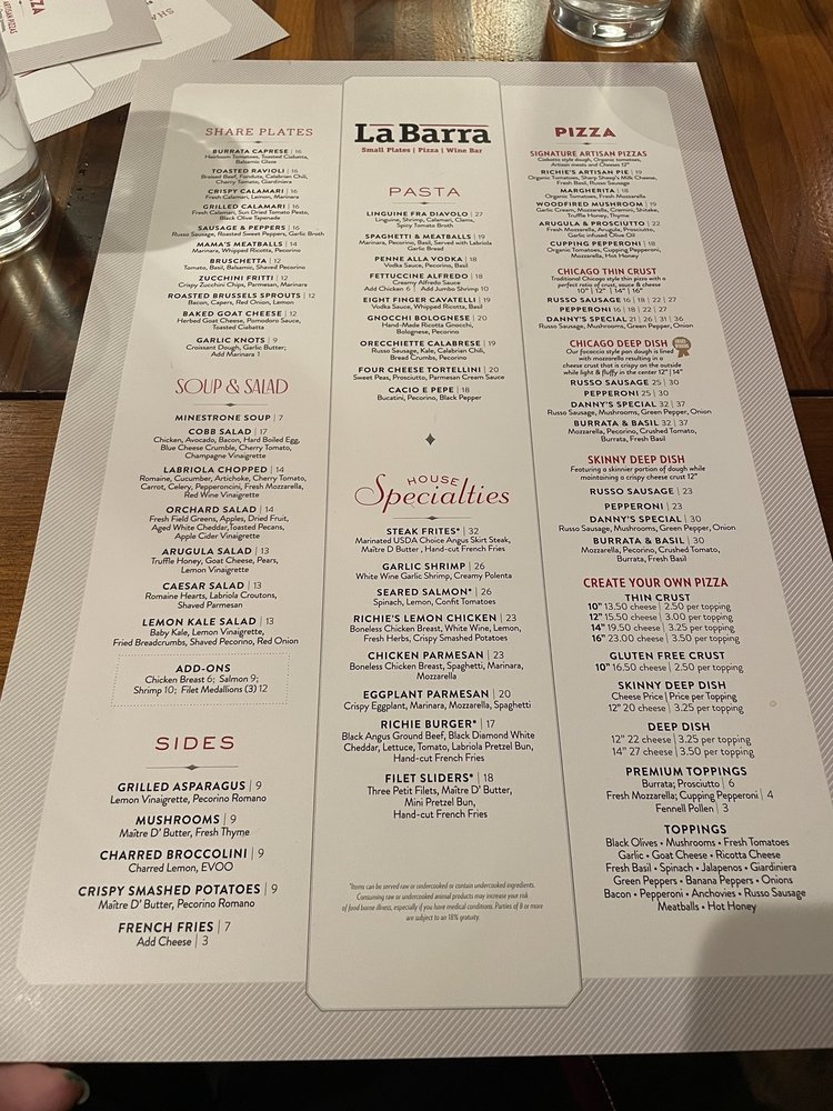 Welcome to Labriola Ristorante, an Italian gem nestled in Oak Brook, IL, where culinary passion meets a vibrant atmosphere. The menu is a delightful exploration of Italian flavors, featuring sumptuous pizzas that cater to every palate. With options like the acclaimed Chicago Thin Crust, topped with savory sausage and fresh vegetables, it’s a must-try for pizza lovers. Guests rave about the generous portion sizes, making every meal satisfying.